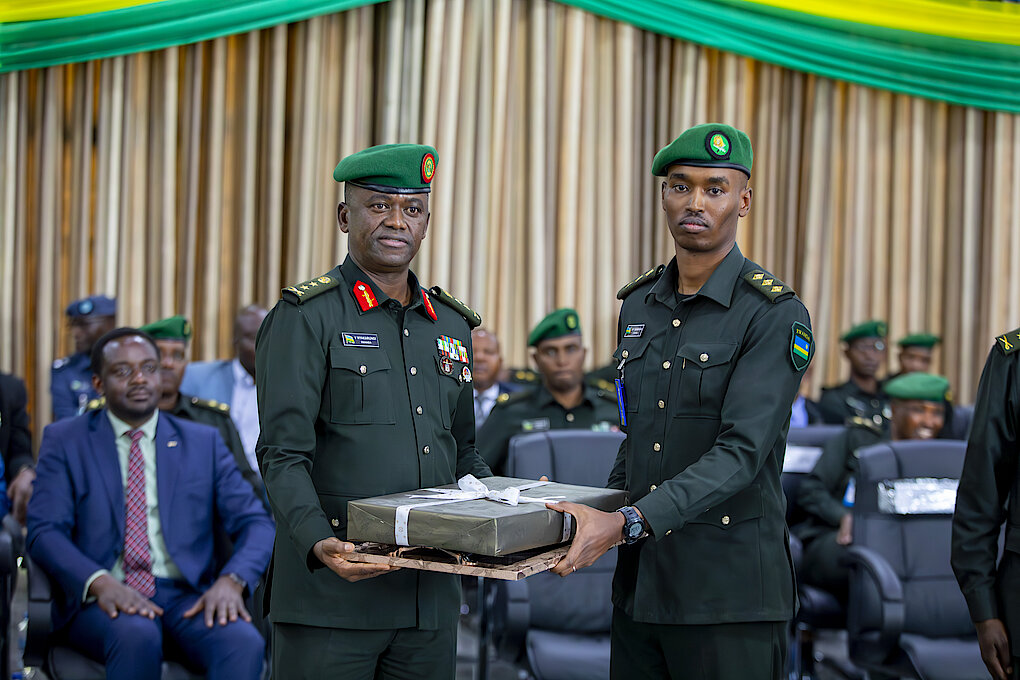 Maj Rowland Mark KAMANZI KALISA the second overall best student and the best Commandant Research Paper, receiving his award