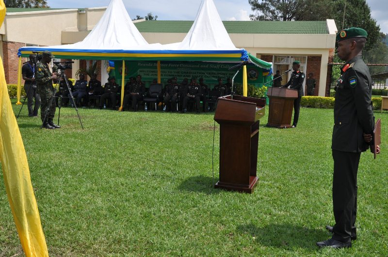 According to the college Chief Instructor, Col J MAJYAMBERE who started the ceremony with the course report, this course is the sixth of its kind and like other preceding courses it is aimed at equipping selected officers with the ability to perform staff duties on a day-to-day basis at all levels of command both in peacetime and in war. Essentially, the course prepares officers for Grade 3 staff appointments and after further experience, for Senior Command and Staff Course training. He informed the gathering, which included the graduates’ spouses and other invited guests, that course has been running for four months and the college was proud to announce that all the 36 officers who were selected to attend the course have successfully achieved the desired end state of the course.
